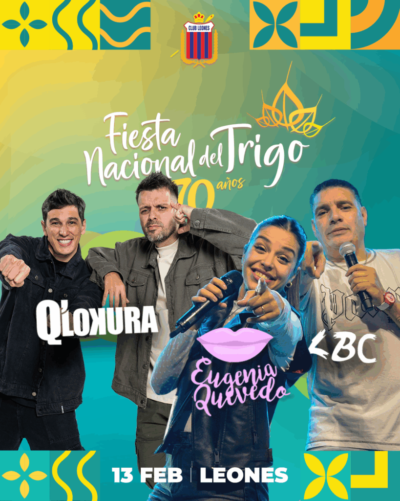 Del 13 al 15 de febrero, la ciudad de Leones será escenario de una edición histórica de la Fiesta Nacional del Trigo, celebrando 70 años de música, tradición y encuentro. Tres noches únicas, con una grilla artística de primer nivel, pensadas para disfrutar en familia y con amigos en uno de los eventos culturales más importantes del país.
