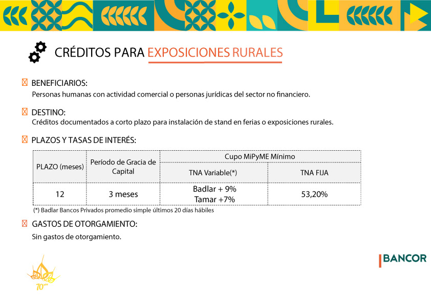 En el marco de la 70ª Fiesta Nacional del Trigo, y a través del vínculo institucional con el Banco de la Provincia de Córdoba (Bancor), ponemos a disposición una línea de financiación especial destinada a expositores que deseen adquirir su stand y participar del evento.